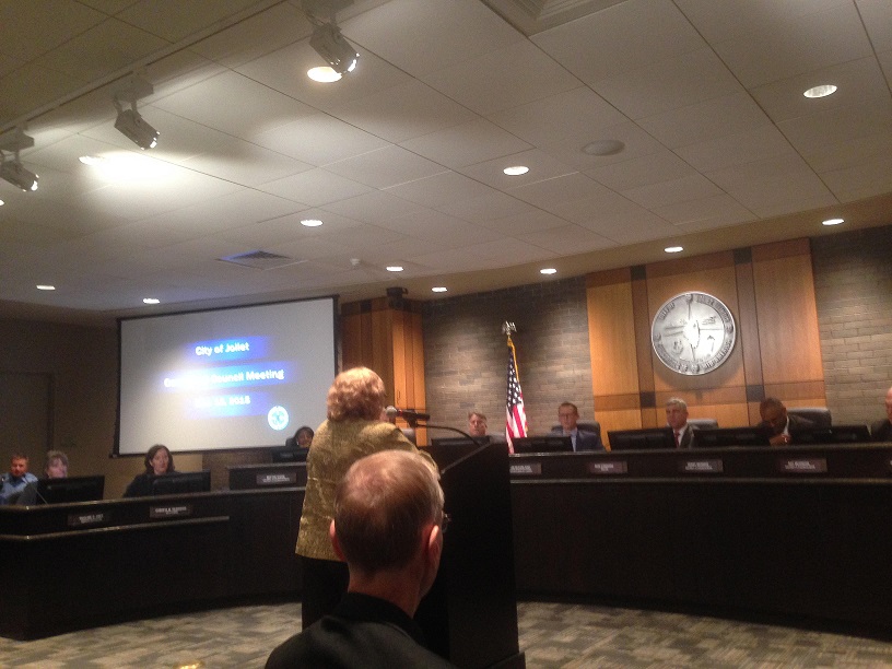 REALTOR® Donna Billings addresses the Joliet City Council while REALTOR® Mark Meers listens behind her.