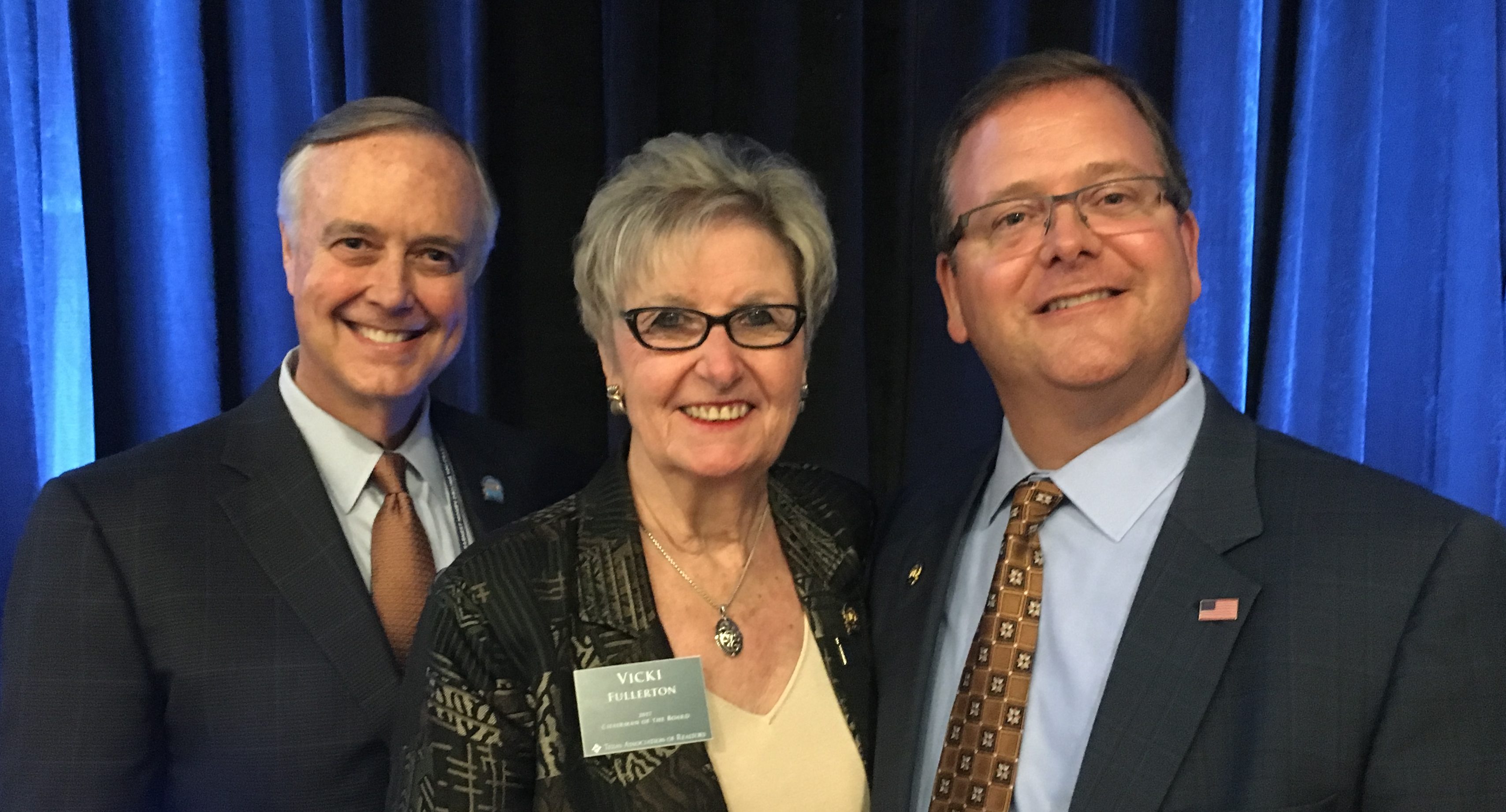 Texas Association of REALTORS® CEO Travis Kessler, 2017 association Chairman Vicki Fullerton and Illinois REALTORS® Treasurer Dan Wagner at the Texas REALTORS® Conference in Dallas on Friday, where Illinois REALTORS® was honored for donating $50,000 for hurricane relief efforts. Photo: Texas REALTORS®.