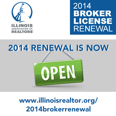 The Illinois real estate broker license renewal is now open at the Illinois Department of Financial & Professional Regulation (IDFPR) website. Renewal deadline is April 30, 2014.