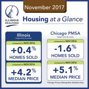 Sales and price information are generated by Multiple Listing Service closed sales reported by 28 participating Illinois REALTOR® local boards and associations including Midwest Real Estate Data LLC data as of Dec. 7, 2017 for the period Nov. 1 through Nov. 30, 2017. The Chicago PMSA, as defined by the U.S. Census Bureau, includes the counties of Cook, DeKalb, DuPage, Grundy, Kane, Kendall, Lake, McHenry and Will.