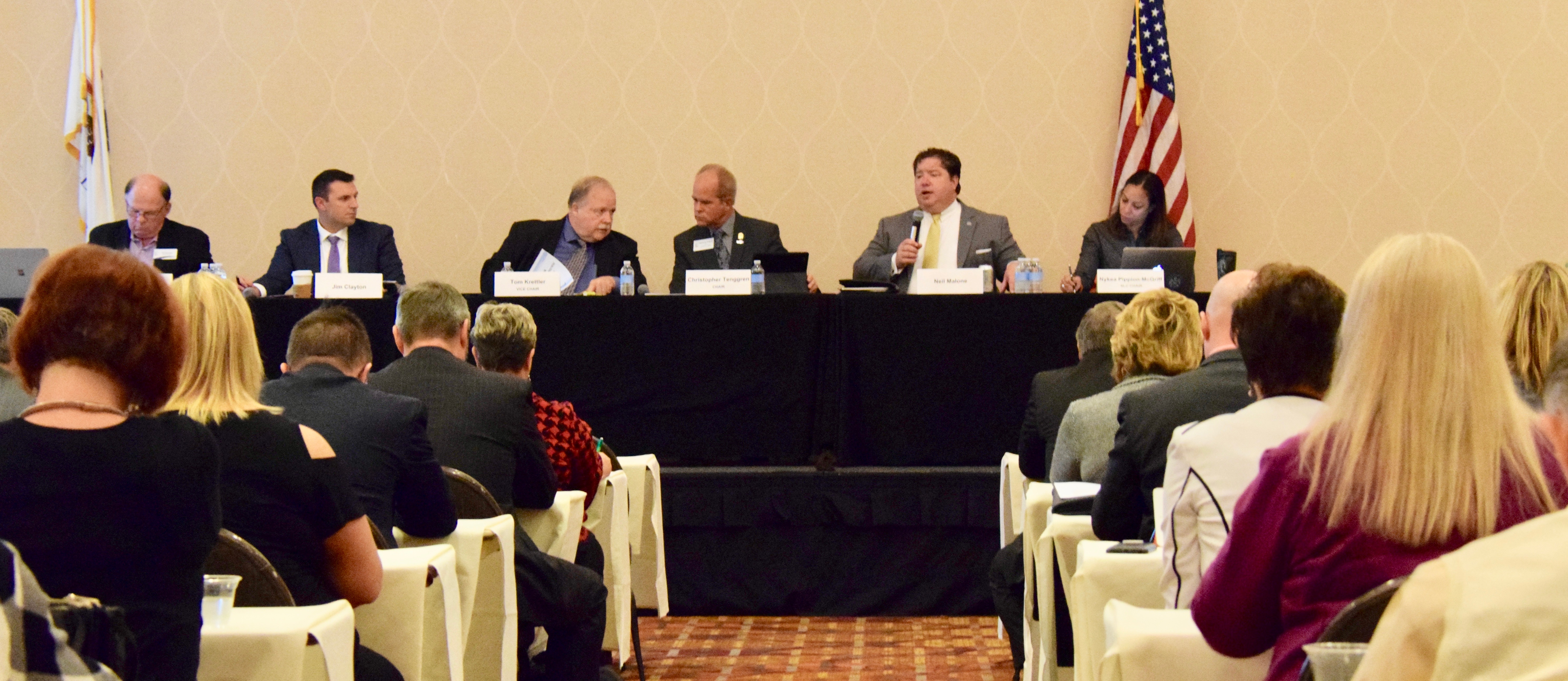 Illinois REALTORS® Political Involvement Committee meets on Thursday, Oct. 12, 2017 at the Chicago Marriott Naperville. Pictured are Treasurer Nominee Ed Neaves, Local Government Affairs Director Jim Clayton, Vice Chair Tom Krettler, Chair Christopher Tenggren, Manager of Grassroots and Political Programs Neil Malone and Nykea Pippion-McGriff.