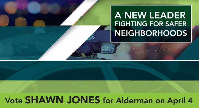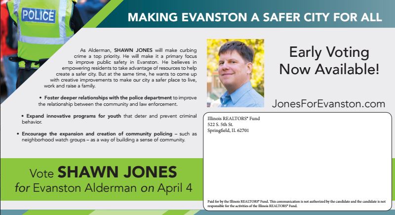 The postcards say Jones will make curbing crime and improving public safety his top priorities as alderman. He wants to foster deeper relationships with members of the police department, expand innovative programs for youth and encourage expansion of community policing. For more information, visit his campaign website, JonesForEvanston.com. Please support Jones if you live in Evanston.