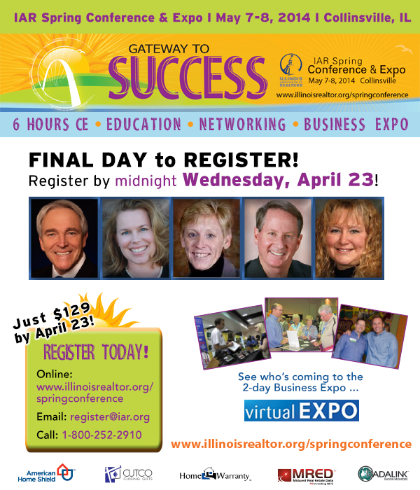 Don’t miss out! April 23 at midnight marks the final deadline to register for the IAR Spring Conference & Expo at the Gateway Center in Collinsville, May 7-8. Gain new insights, network with like-minded business people and earn up to 6 hours of CE! REGISTER NOW.
