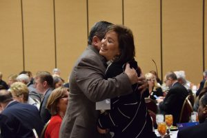 Sonia Anaya embraces a colleague after being announced as the recipient of the award.