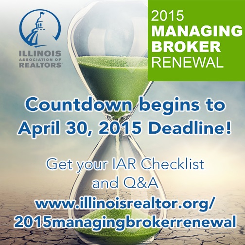 Managing broker licensees must complete continuing education requirements and apply to the Illinois Department of Financial and Professional Regulation (IDFPR) to renew their licenses by April 30, 2015.
